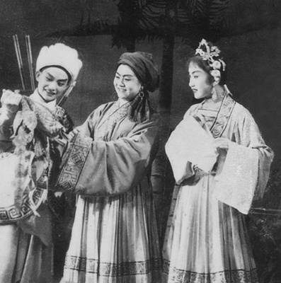 1980年演出的《梁山伯与祝英台》第一场“英台别家”剧照。左一是饰演祝英台的陈小珠、左二是饰演祝母的的李小玲、右一是饰演祝父的黄秋明。