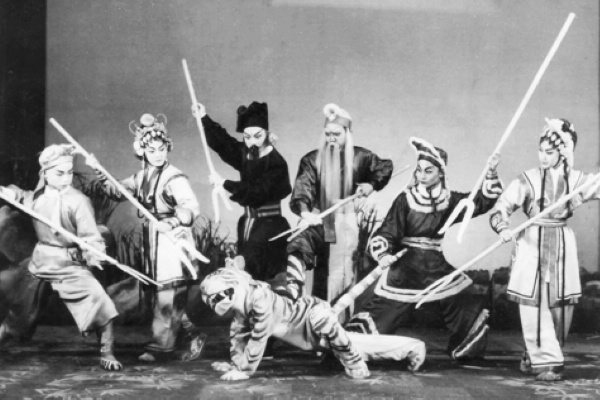 1959年演出的《双结缘》第一场“打虎”剧照。 右一是饰演司马素英的陈小珠,右二是饰演冯俊安的张祖基,右三是饰演司马大年的欧阳绍,右四是饰演司马海的林炳坤, 右五是饰演冯秀霞的利飞, 右六是饰演司马平的易锦全, 扮演老虎的是易锦荣。
