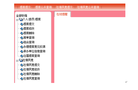 3.系统功能 主要完成委员提案提交、修改、删除、查询、办理意见反馈、承办单位信息查询、往届提案查询及社情民意提交等 登录成功后显示以下界面。