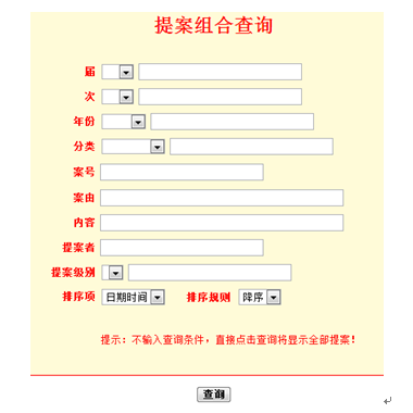 3.4提案查询 点击网站左边业务分类栏“提案查询”按钮可弹出以下对话框。选择查询项目,输入查询关键字,点击查询按钮即可。注:只能查询本人的提案。