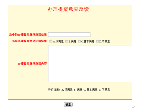5、办理意见反馈 点击网站左边业务分类栏“办理意见反馈”按钮。再点击右侧的“评价”按钮,选择办理提案意见反馈结果,填写“办理提案意见反馈内容”。最后点击“确定”提交。 注:委员只能评价本人提交的提案