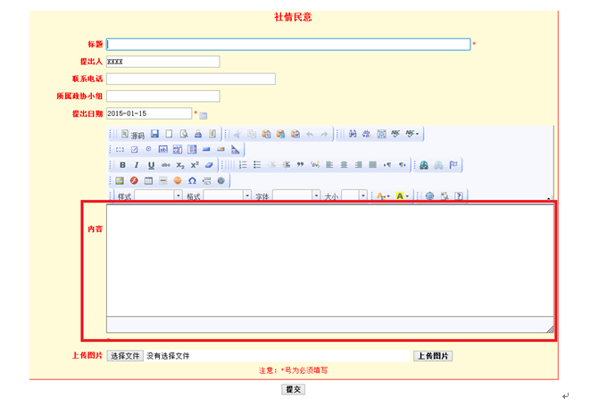 另外,委员还可以查询承办单位信息和往届本人的提案信息。 4.党派、团体提案管理模块的操作 请参考个人(委员)提案管理。 5.社情民意管理模块的操作 5.1社情民意提交 点击社情民意提交,输入标题和内容后点击提交按钮。