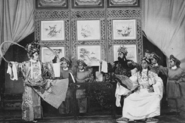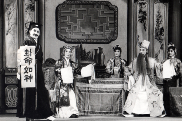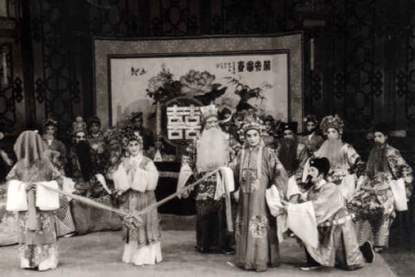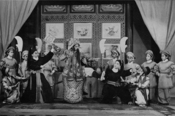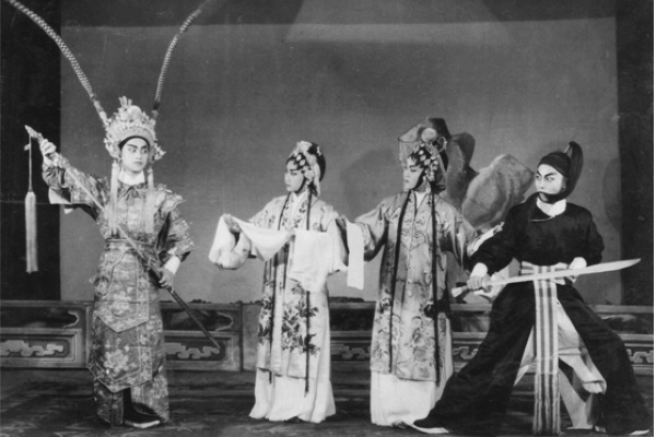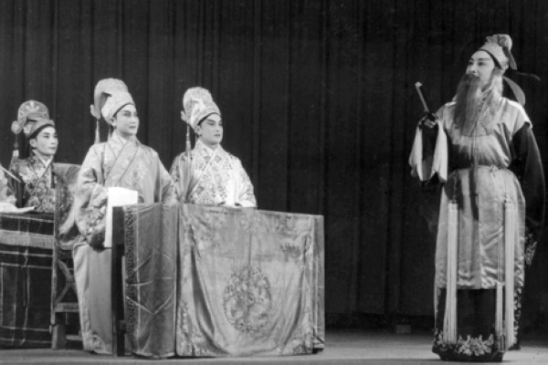 1959年演出的《双结缘》第二场“乱府” 剧照。左一是饰演冯俊安的张祖基,前排右一是饰演三王的郭威松,戴黑须者是饰演二王的招桂生。