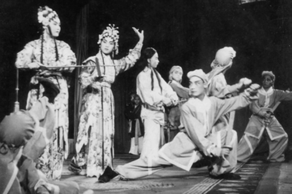 1959年演出的《刘三姐》 尾场 剧照。右一是饰演小牛的张祖基,右二是饰演刘三姐的陈小珠。