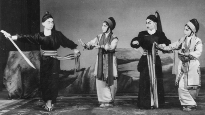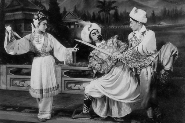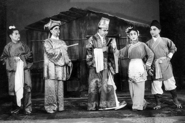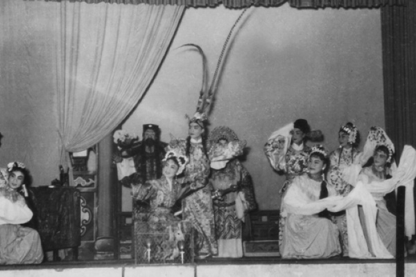 1965年演出的《补镬》剧照。右一是饰演李小聪的张祖基,左一是饰演刘兰英的陈小珠。