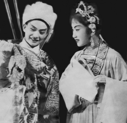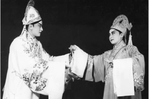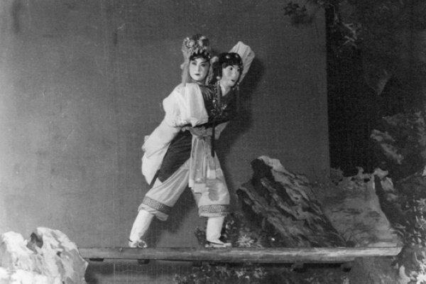 1980年演出的《梁山伯与祝英台》第四场“十八相送”剧照。右一是饰演祝英台的陈小珠,左一是饰演梁山伯的李汉铭。