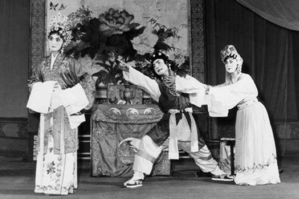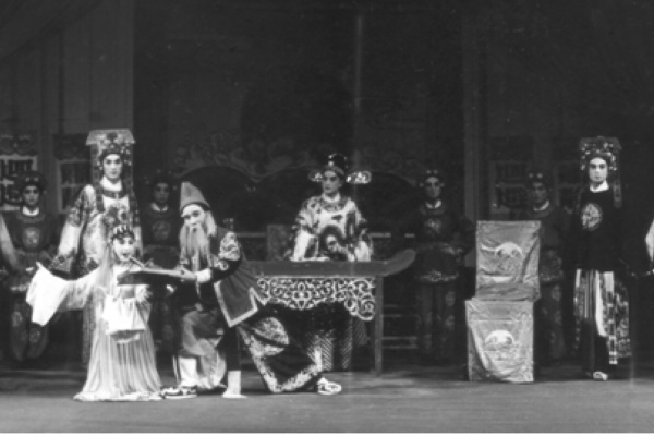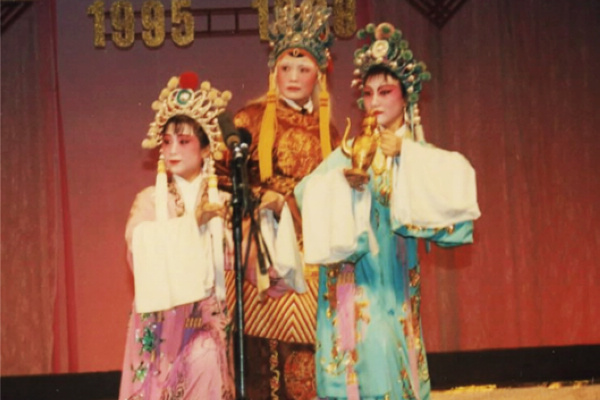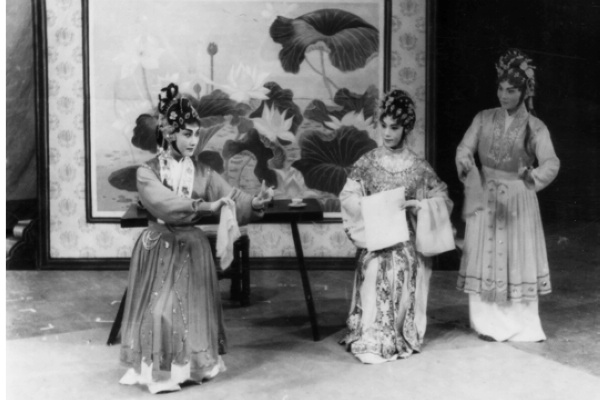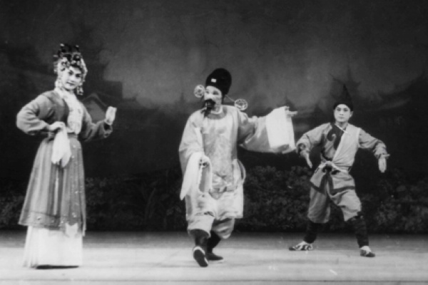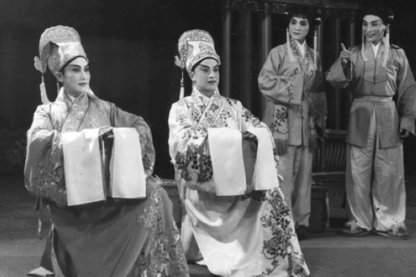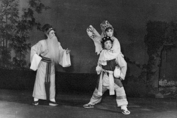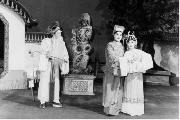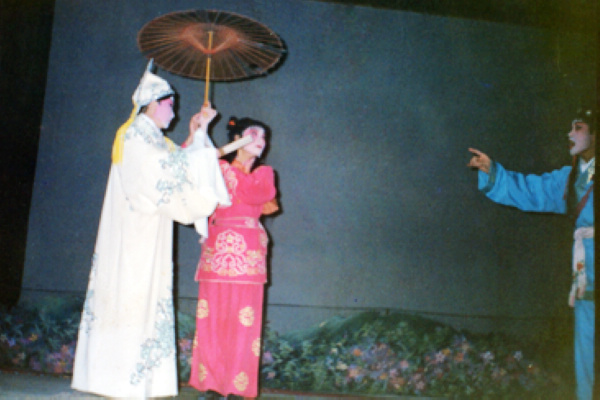 1980年演出的《梁山伯与祝英台》第一场“英台别家”剧照。左一是饰演祝英台的陈小珠、左二是饰演祝母的的李小玲、右一是饰演祝父的黄秋明。