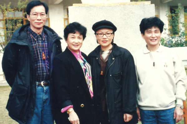 香港粤剧名伶文千岁、梁少芯来艺校参观指导,陈小珠、张祖基与他们的合照。