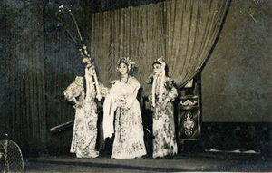 1959年演出的《百鸟衣》第五场剧照。左一是饰演依妮的陈小珠,左二是饰演土司的林炳坤,左三是饰演古卡的张祖基。 戏院是个大会堂,门口的大理石柱很够气派,里面可坐几千人。当地的县委书记、县长都爱睇(看)大戏,看到我们第一晚演出的《杨门女将》,场面壮观,行当齐全,文戏擅唱,武戏能打,很是赞赏。散场后,他们到舞台看望我们,知道我们平均年龄不足十八岁,能演得这样好,十分惊讶。又知我是顺德人,更显乡情亲,即吩咐在旁的供销社负责人说:“他们这样年轻,正长身体,演出咁(这么)辛苦,明天给他们加菜,保证每天供足肉食。” 当时国家经济处于困难时期,物质供应有一定困难,县委领导却如此关爱我们,让我们感动万分,得宠如大戏中的公主。以后,我们演戏更卖力了,观众也更满意。在县委大会堂演出后,我们转到各乡镇去演出,各乡镇也热情款待我们,每餐饭菜,总少不了大鱼大肉。我也不再厌食,虽然每晚要担演主角,体重却长了七八斤。 在我的家乡顺德演出,每晚总会有我的亲戚、同乡来看戏。有一晚我正在演出《百鸟衣》第五场,我饰演的“依妮”迎着“土司”举着的腰刀,不惧淫威,双手按着腰际,威武不屈亮相,“土司”手拿的腰刀多次欲砍杀,气氛正严肃紧张之际,突然,两个四五岁的小女孩发出尖厉的哭喊:“唔(不)准杀我姑姑呀!唔(不)准杀我姑姑呀!”众人都惊愕了。原来是一个同乡的孖女,看戏看到当了真!
