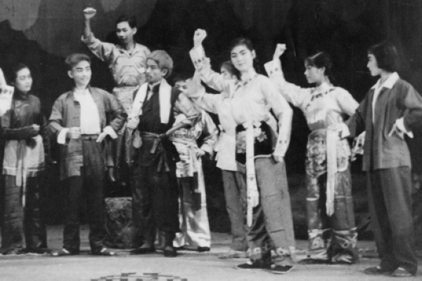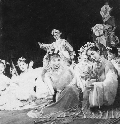 1959年演出的《百鸟衣》剧照。右一是饰演依妮的陈小珠,左一是饰演古卡的张祖基。 |