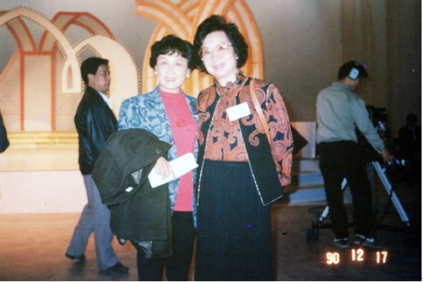 1990年12月在广州两广粤剧名曲总决赛担任评委。前排左一陈小珠与粤曲“平喉”名家黄少梅老师合照。