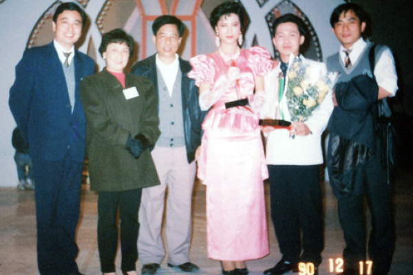 1990年12月陈强获两广粤剧名曲卡拉OK总决赛亚军。左一是评委李少明,左二是评委陈小珠,右二是陈强。 hr