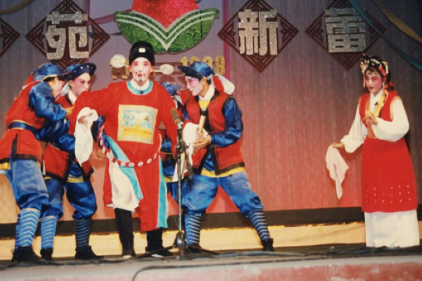 1980年演出的《梁山伯与祝英台》“柳荫结拜”剧照。左一是饰演祝英台的陈小珠、左二是饰演梁山伯的李汉铭,右一是饰演士九的张祖基,右二是饰演人心的张燕萍。