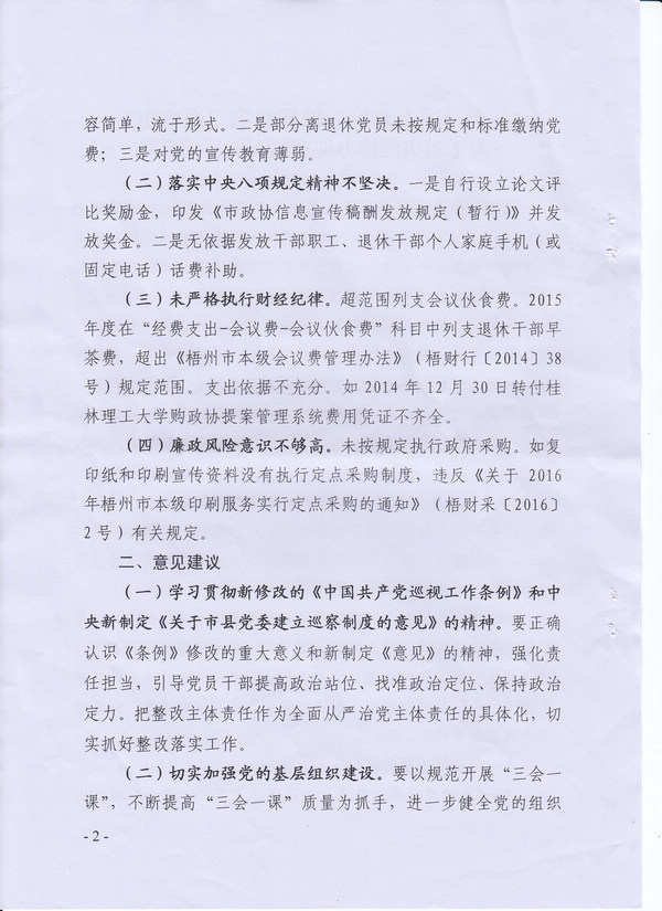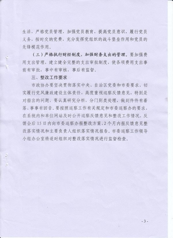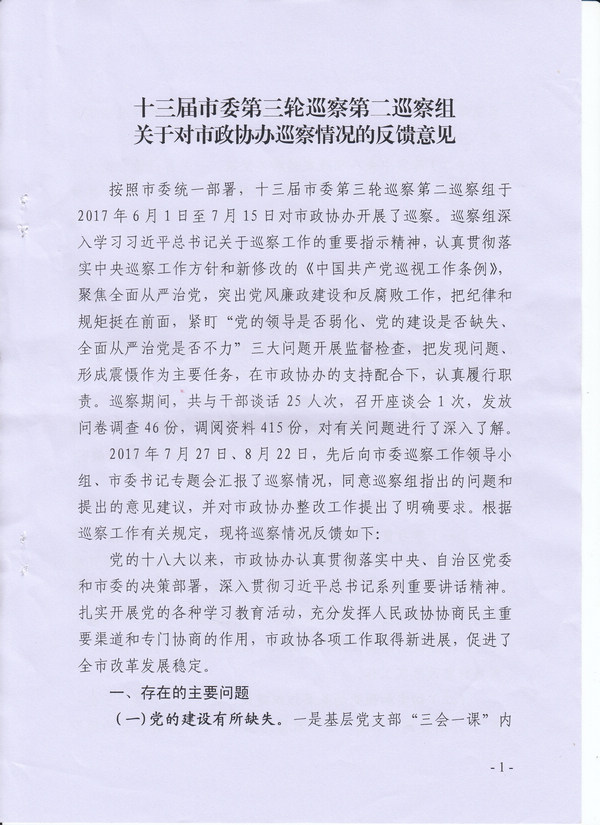 十三届市委第三轮巡察第二巡察组关于对市政协办巡察情况的反馈意见