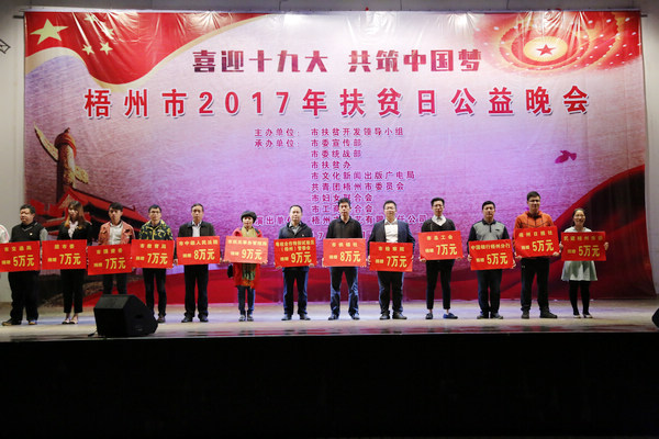 扶贫日公益晚会现场 10月17日晚,在市扶贫开发领导小组主办的“喜迎十九大·共筑中国梦”梧州市2017年扶贫日公益晚会上,民建梧州市委荣获2017年度梧州市脱贫攻坚贡献单位。 2017年以来,民建梧州市委在中共梧州市委、市政府的正确领导下,在市扶贫办的具体指导和各相关部门的支持配合下,根据中共梧州市委、市政府的要求,把帮扶工作作为民办实事、办好事的民心工程来抓。市委会专职副主委多次带领机关专干赴岑溪市梨木镇云开村开展定点帮扶工作,并通过进村入户、实地调研、探访贫困户等方式,进一步了解结对帮扶的贫困户的家庭情况,与帮扶单位及当地党委政府一起为云开村的发展寻找对策、引进项目,如我委积极发动会员企业广东浩瀚工程设计有限公司梧州分公司为云开村捐赠价值3.6万元的太阳能路灯6盏,改善了村民晚上出行的安全问题。同时,结合我委实际,创新工作方法,通过发动会员募集捐赠资金、物资,单位、个人捐资捐物等形式,扎扎实实开展扶贫捐赠活动,截至目前,捐赠款物共计五万多元,较好地完成了帮扶工作任务。 在此次晚会中,民建会员企业广西百裕商贸集团、广西梧州圣源茶业有限公司等企业也荣获2017年度梧州市脱贫攻坚贡献单位。 (莫彩燕) |